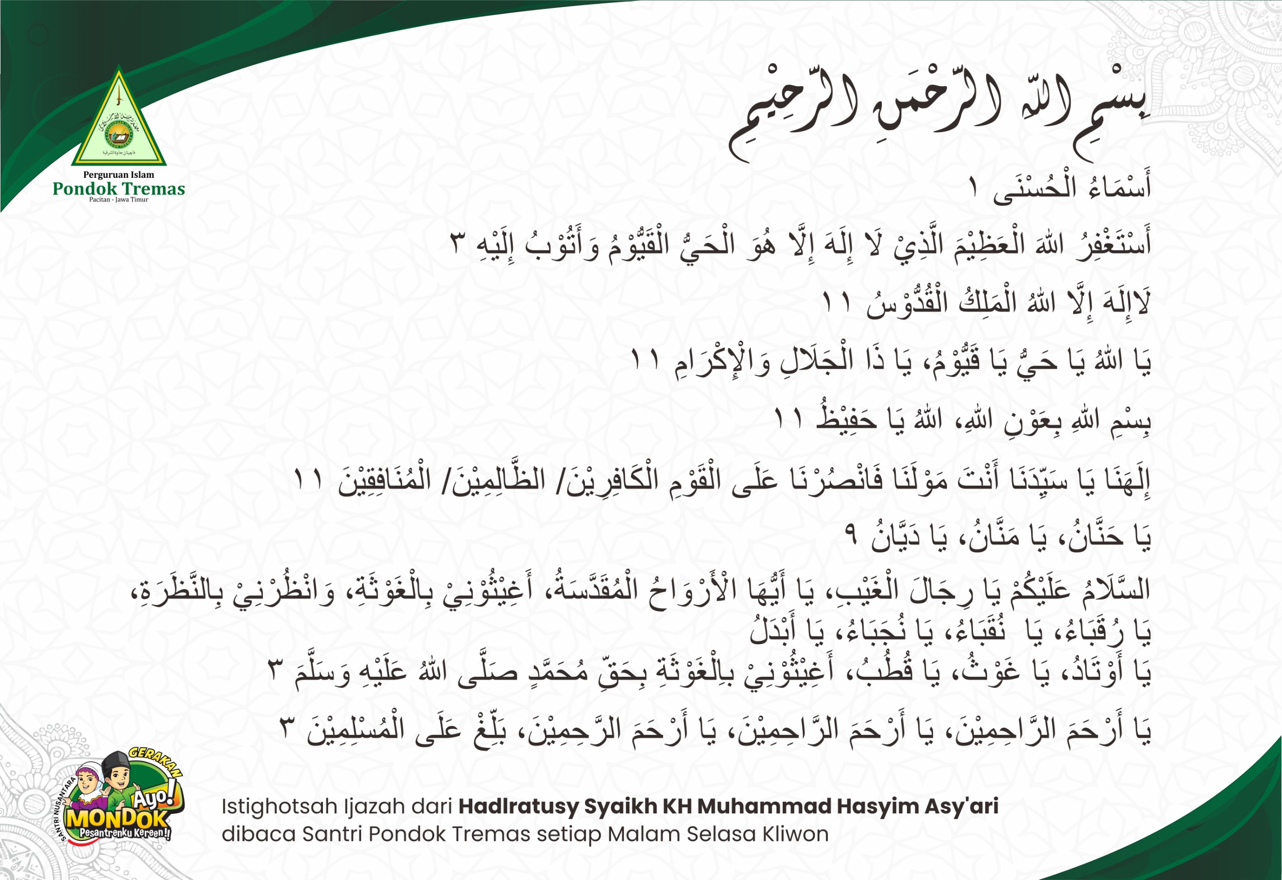 Untuk wirid istighotsah Hadratussyaikh KH Hasyim Asyโari ini, sekarang sudah mulai diamalkan bersama-sama oleh santri Tremas dan dibaca setiap malam Selasa Kliwon. Kiai Luqman sendiri yang memimpin langsung amalan istighotsah ini.